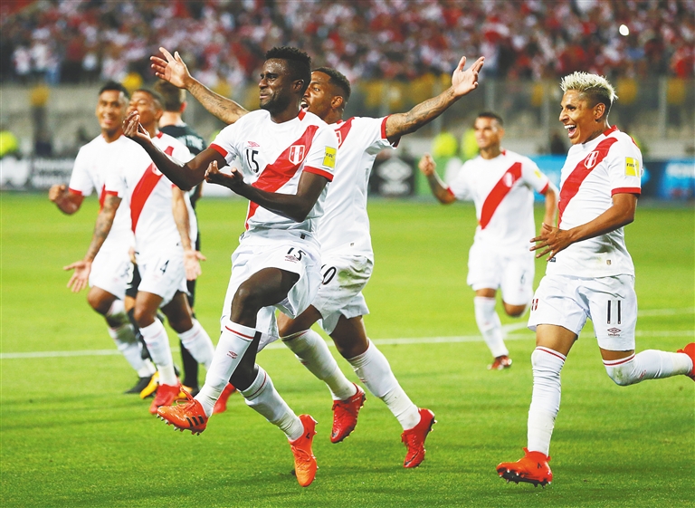 北京时间11月16日,在俄罗斯世界杯预选赛附加赛第二回合比赛中,秘鲁队在主场以2:0战胜新西兰队,从而以2:0的总比分获胜,晋级世界杯决赛圈,成为最后一支获得世界杯入场券的球队。图为秘鲁队球员庆祝进球。
