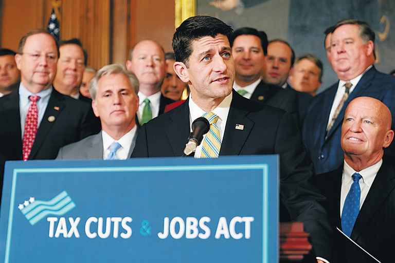 11月16日,在美国华盛顿国会山,众议院议长保罗·瑞安在新闻发布会上发言。 美国国会众议院16日投票通过减税法案,迈出了美国三十年来最大规模减税计划的第一步。美国企业和多数家庭税负将有所降低,但同时联邦财政赤字将大幅攀升。 新华社发