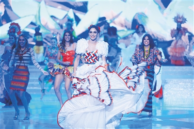 11月17日晚,在三亚技工学院体育馆,第67届世界小姐总决赛晚会进行最后环节的带妆彩排。图为参赛佳丽们身着盛装,在舞台上进行舞蹈节目的精彩表演。18日晚上,新一届世界小姐全球总冠军将在这里诞生。