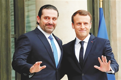 11月18日,法国总统马克龙(右)在爱丽舍宫欢迎此前宣布辞职的黎巴嫩总理哈里里。