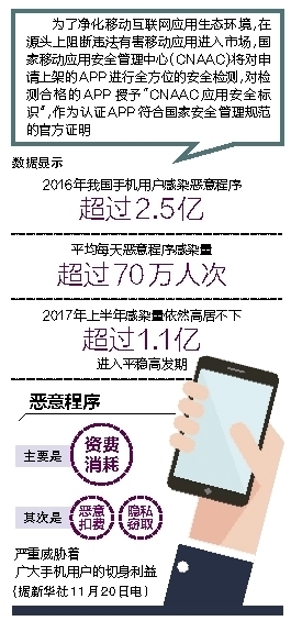 为了净化移动互联网应用生态环境,在源头上阻断违法有害移动应用进入市场,国家移动应用安全管理中心(CNAAC)将对申请上架的APP进行全方位的安全检测,对检测合格的APP授予“CNAAC应用安全标识”,作为认证APP符合国家安全管理规范的官方证明 数据显示 2016年我国手机用户感染恶意程序 超过2.5亿 平均每天恶意程序感染量 超过70万人次 2017年上半年感染量依然高居不下 超过1.1亿 进入平稳高发期 恶意程序 主要是 资费消耗 其次是 恶意扣费 隐私窃取 严重威胁着 广大手机用户的切身利益 (据新华社11月20日电)