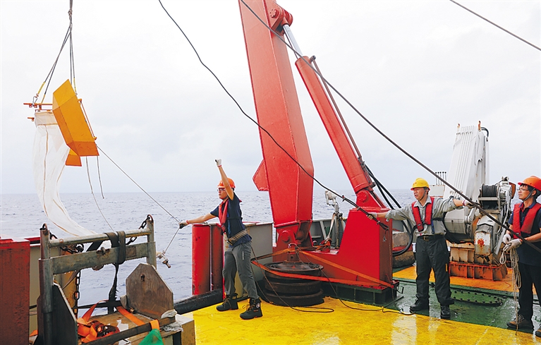 科考队员用“雪龙”号后甲板的绞车和A型架等大型设备将微塑料采样器放入海中。19日,中国第34次南极科学考察队队员在西太平洋海域进行海洋微塑料取样作业,这是科考队出征以来首次在航线上开展调查作业。新华社发