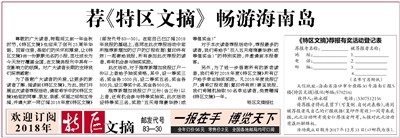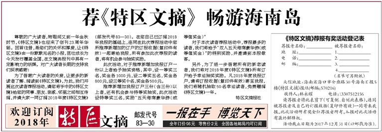 为了答谢广大读者的关爱,让更多的新读者了解、阅读到《特区文摘》,为此,我们开展这次读者荐报活动,请您将手中的《特区文摘》给您的同事、朋友、亲戚、邻里之间相互传阅,并请大家一同订阅2018年度《特区文摘》(邮发代号83—30)。在您自己已订阅2018 年我报的基础上,连同在此次荐报活动中您所推荐新增加的订户的订报收据(复印件有效)一起寄给我报,所有参加此次荐报的读者,将有机会参与抽奖奖励。