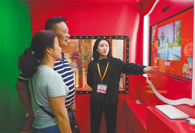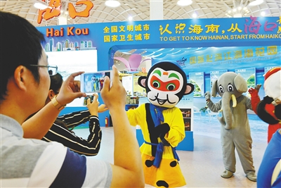 “认识海南,从海口馆开始……”,巨大的LED屏幕上正在播放旅游宣传视频,展现了海口国际化滨江滨海花园城市之美;椰雕、咖啡、养生食品等特色旅游产品也被搬进展馆,引得不少游客驻足了解;馆内现场助阵的卡通人物更是萌翻全场,孩子们频频上前合影留念。