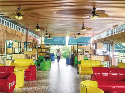 什日宛驿站内还有一栋两层楼的木制建筑,沿着楼梯走上二楼,第一时间就会闻到一缕咖啡香。没错,这是一个公路驿站的咖啡厅,人们可以在这里品尝到琼中海拔280米之上山区盛产的飞瀑山咖啡。山区的气候总是那么多变,明明还是阳光明媚,霎时就云雾缭绕,细雨纷飞,在这样的地理环境和气候条件下生长的咖啡,应该是风格独特,口感多元的。如果你是一个咖啡控,又怎么能错过这一杯惊喜呢?而我一定会选一本未必着调的书,点上一杯焦糖香的咖啡,坐在那张用大铁桶砸出凹槽的彩色座椅上,消磨一段自由惬意的午后时光。