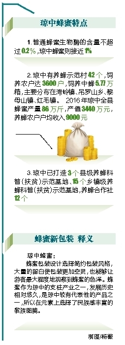 “以‘琼中蜂蜜’作为正标题,地域名称加上产品名称,形成地理标志。副标题‘甜言蜜语’,情感色彩比较浓郁,形象表达了琼中的蜂蜜甜香润滑的口感特点。”参与包装设计的工作人员说,希望消费者吃了琼中蜂蜜,就连语言都透着甜蜜。