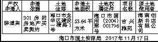 根据海南省人大常委会《关于加快积压房地产产权确认工作的决定》,现将海口市国土资源局对下述积压房地产土地确权登记申请的审核情况予以公布(详见下表)。对公布的土地使用权、所有权及他项权利有异议者,请于通告之日起60日内,以书面形式并持有关证据到海口市国土资源局龙华分局(国贸二横路国土大厦14楼)办理异议登记或复查手续。逾期没有提出异议的,即认为公布的权益无异议。联系电话:68512605。特此通告。