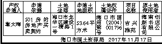 根据海南省人大常委会《关于加快积压房地产产权确认工作的决定》,现将海口市国土资源局对下述积压房地产土地确权登记申请的审核情况予以公布(详见下表)。对公布的土地使用权、所有权及他项权利有异议者,请于通告之日起60日内,以书面形式并持有关证据到海口市国土资源局龙华分局(国贸二横路国土大厦14楼)办理异议登记或复查手续。逾期没有提出异议的,即认为公布的权益无异议。联系电话:68512605。特此通告。
