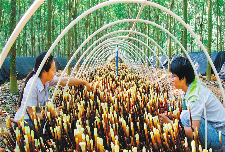 林才伟介绍,儋州牧春公司在发展的同时,十分关注贫困户的脱贫事业,公司在儋州橡胶林地区采取了“公司+基地+合作社+贫困户”的利益联结机制,先后在儋州市雅星镇茶山村、雅星镇鹅岛村、大成镇对娥村、南丰镇海曼村、那大镇牛路窝村、新盈农场、那大镇合罗农场等橡胶林下资源丰富的地区与建档立卡贫困户精准合作,通过林下空地流转、菌林栽培合作、劳务雇佣等多种形式与贫困户、农户共同完成菌草食(药)用菌橡胶林下精准扶贫种植1000余万袋,累计带动农户800余户,其中贫困户300余户,实现合作农户户均增收1万元以上。