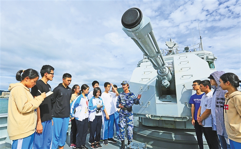 当天,南海舰队某基地为海南中学学生开展国防教育实践活动。该基地组织学生们参观舰艇装备,了解军营文化,讲述海军战斗故事等,推动国防教育进课堂、进思想,深化青年学生对国防事业的思想认同、情感认同,不断增强关注国防、热爱国防、投身国防的意识和热情。