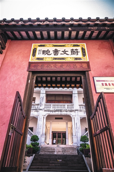 粉红的墙体,灰黑的瓦顶,青色的瓦当,依傍小山而建,拾级而上,玄武岩的台阶,精美的木雕,有中庭,有前院,有后堂,有后院,有尊经阁,还有花草树木散布其间……位于文昌市区孔庙和文昌阁右侧的蔚文书院旧址,虽居闹市,却很宁静祥和,就像是一座小型的园林。
