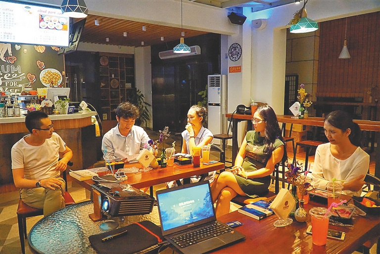 日前,三亚“云港咖啡”变身为交流课堂,来自不同行业的十余名年轻人围坐交流读书心得,讨论话题涉及社会养老、亲情表达等。