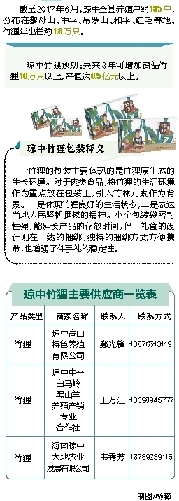据统计,截至2017年6月,全县养殖户约135户,分布在全县黎母山、中平、吊罗山、和平、红毛等地。竹狸年出栏约1.8万只。