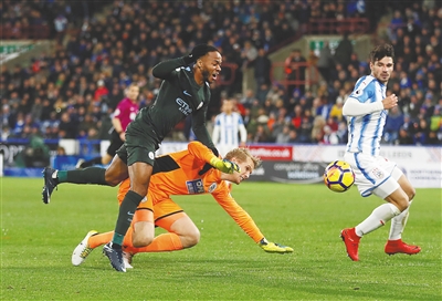 在北京时间27日凌晨进行的英超联赛第13轮比赛中,曼城队以2∶1击败哈德斯菲尔德队之后赢得创俱乐部纪录的联赛11连胜,并以8分的优势在积分榜上领跑。图为曼城球员斯特林(左)与对手拼抢。新华社发