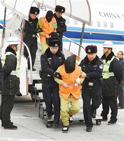11月28日,在哈尔滨太平国际机场,犯罪嫌疑人被押解下飞机。在公安部的组织指挥下,黑龙江省、市、区三级公安机关联动,转战多个省份,捣毁6个以商务咨询公司为掩护的诈骗犯罪窝点,抓获涉案人员234人,成功侦破了公安部督办的哈尔滨市“2017.11.6”系列诈骗案件。新华社发