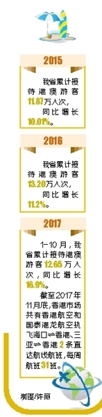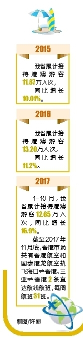 今年以来,我省积极“走出去”促销,加大了对港澳市场的投入力度,“一个钟,假给海南”“有一种美好时光 叫海南”等海南形象广告全面铺开,5家海南旅游产品展示与咨询中心也同步在两地运营。得益于一系列强有力的鼓励政策和不断创新的推广促销,我省接待港澳游客量实现快速增长:今年1-9月,海南累计接待香港游客11.59万人次,同比增长17.9%;接待澳门游客0.99万人次,同比增长23.6%,增速明显。