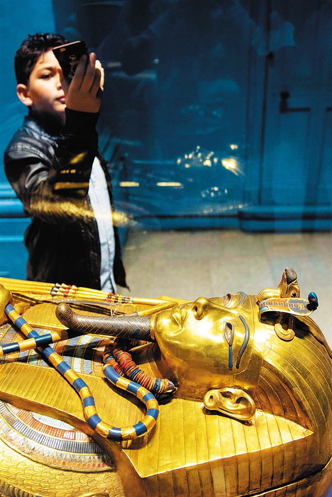 11月28日,在位于埃及首都开罗的埃及博物馆内,一名男孩拍摄古埃及法老图坦卡蒙的镀金棺。 坐落于开罗市中心的埃及博物馆28日晚举办建馆115年庆典,埃及各界人士与来自全球的考古学家齐聚一堂,为这一埃及文物界的“百年老店”庆生。 新华社/法新