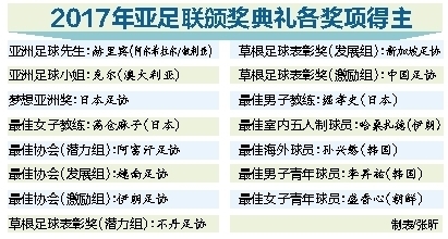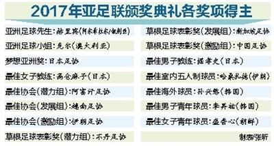 2017年的亚足联颁奖,中国足球(人)一共获得了4个奖项的提名,其中武磊连续2年成为亚洲足球先生的候选人,高红再次成为最佳女子教练的候选人。中国足协获得了梦想亚洲奖和草根足球表彰奖(激励组)2个奖项的提名。