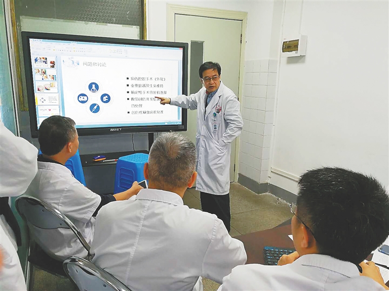 记者采访当天,早上7时不到,崔海宁就已经在医院查房。虽然忙得脚不沾地,可他依然精神奕奕。上午9时,刚查完病房,顾不上喝口热水,崔海宁又召集了科室十几名医生,对一个严重创伤手术病例展开讨论。