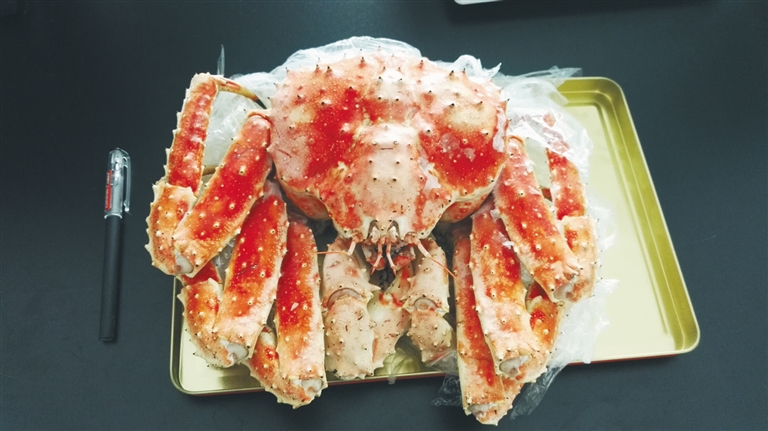 11月17日,一件香港入境旅客的可疑行李进入海口机场检验检疫局旅检科检疫人员的视线。在对可疑行李进行开包查验时,检疫人员赫然发现一只巨大的帝王蟹。