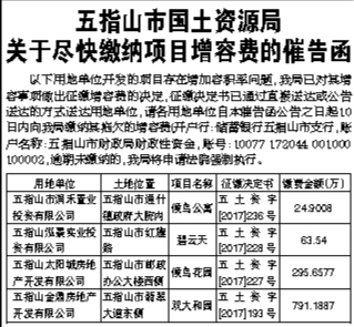 五指山市国土资源局关于尽快缴纳项目增容费的催告函