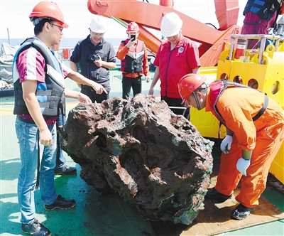 科考队员在查看从海底获得的块状硫化物样品。正在执行中国首次环球海洋综合科考暨中国大洋科考46航次的“向阳红01”船,于西一区时间11月30日在南大西洋采集到一块单体重约3吨的块状硫化物样品。这是目前中国采集到的单体最大块状硫化物样品。 新华社发