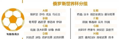 抽签结果为:A组:俄罗斯、沙特、埃及、乌拉圭;B组:葡萄牙、西班牙、摩洛哥、伊朗;C组:法国、澳大利亚、秘鲁、丹麦;D组:阿根廷、冰岛、克罗地亚、尼日利亚;E组:巴西、瑞士、哥斯达黎加、塞尔维亚;F组:德国、墨西哥、瑞典、韩国;G组:比利时、巴拿马、突尼斯、英格兰;H组:波兰、塞内加尔、哥伦比亚、日本。