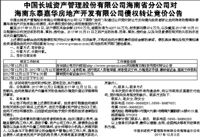 中国长城资产管理股份有限公司海南省分公司对海南东泰嘉华房地产开发有限公司债权转让竞价公告