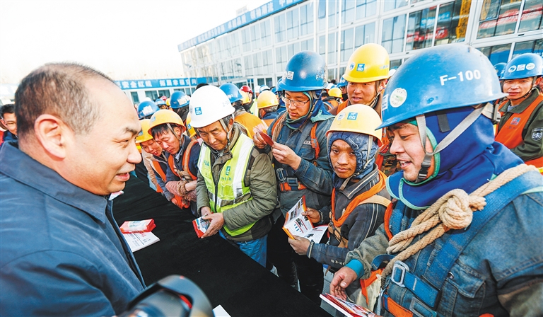 12月1日,在全国保障农民工工资支付宣传活动启动仪式现场,在北京某建筑工地务工的农民工在咨询拖欠工资等方面的问题。 当日,全国保障农民工工资支付宣传活动启动仪式在北京举行,全国农民工工资支付情况专项检查工作同步启动。 新华社发