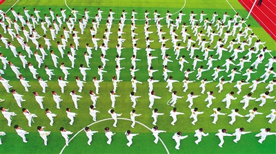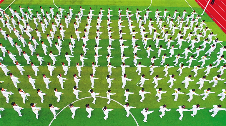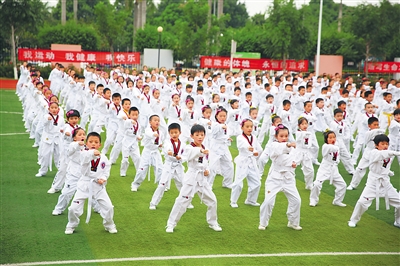 12月1日,海口滨海小学500多名学生在运动场参加跆拳道礼仪操表演。该校将热身操、礼仪操、防身操等多项内容作为跆拳道礼仪操校本课程,通过跆拳道比赛来强健学生体魄,陶冶学生情操,培养学生勇于拼搏的精神。
