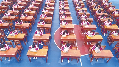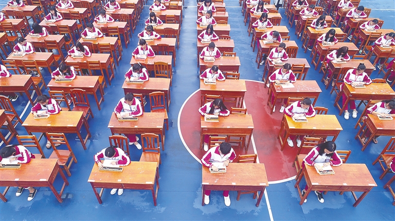 近日,海南省商业学校2017级学生在学校运动场上参加珠算技术竞赛。