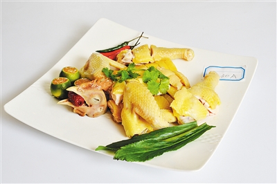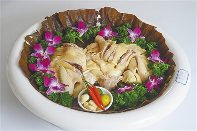 2、改用慢火浸煮约5分钟,用铁勾将鸡提起,倒出腹腔汤水,再放入汤中浸煮,反复三四次至仅熟(不可过生也不可过熟)。离火后另放凉汤中浸泡稍冷却后取出,抹上一层香麻油,使皮色淡黄光亮,食时斩件装盘,砌成原鸡形上席。