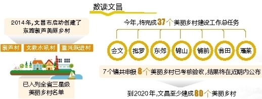 文昌美丽乡村建设,重点打造文博高速、海文高速、文昌滨海旅游公路、八门湾、木兰湾等“三边四湾”沿线美丽乡村,通过路桥等工程,将美丽乡村串联起来,让游客一路嗨到底。同时将琼北大草原涵盖的村庄纳入其中,力争到二O二O年建成八十个美丽乡村。