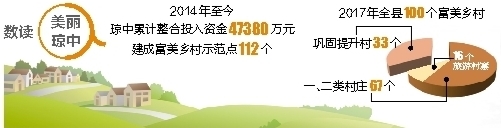 今年以来,琼中按照“规划引领、示范带动、全面推进、配套建设、突出特色、持续提升”的要求,坚持以扶贫攻坚为导向,以基础设施、产业发展和特色黎苗风貌为核心,以“四大工程”(即产业富民工程、特色居家乡村工程、黎苗文化传承工程、社会管理创新工程)为抓手,通过“连点、串线、成片”推进方法,在全县高规格、高品质建设100个富美乡村,其中,Ⅰ类示范村26个,Ⅱ类示范村41个,巩固提升村33个,建成一批集“富、美、趣”于一体,可游可憩、宜商宜居的社会主义新农村。