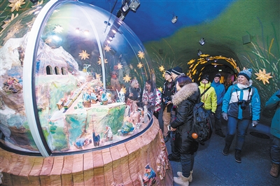 12月7日,几名中国游客在瑞士中部伯尔尼州因特拉肯地区的少女峰景区超级冰宫内游览。 今年,两国双向旅游人数有望突破140万人次。未来五年,预计中国出境旅游人数将达7亿人次。 新华社发