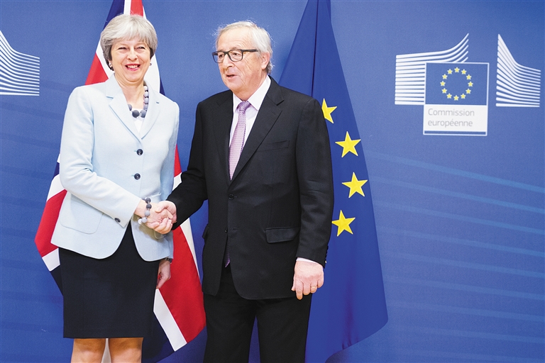 12月8日,在比利时首都布鲁塞尔的欧盟总部,英国首相特雷莎·梅(左)会见欧盟委员会主席容克。特雷莎·梅当日与容克举行一周内的第二次“脱欧”会谈,双方就爱尔兰边界、欧盟在英公民权利、“分手费”等核心议题取得一致,这标志着双方即将开启第二阶段谈判。 新华社发