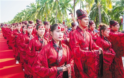 现场,100对夫妇情牵海角天涯,共行沃盥、同庭、合巹、结发、拜堂等汉式婚礼礼仪(见上图,本报记者 武威 摄),向市民游客还原一场传统汉式婚典,展现中华民族传统婚典文化的古韵之美。燃香祭拜、同牢合卺、解缨结发等极具“中国范儿”的汉式婚礼环节,将婚典活动推向高潮。