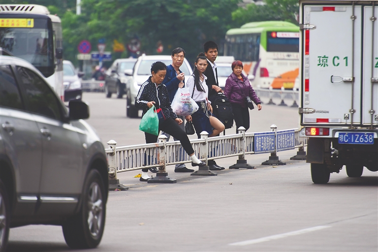 黑榜 12月9日下午,在琼海市东风路百家汇超市门前,几名行人横跨马路中央护栏。