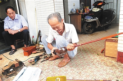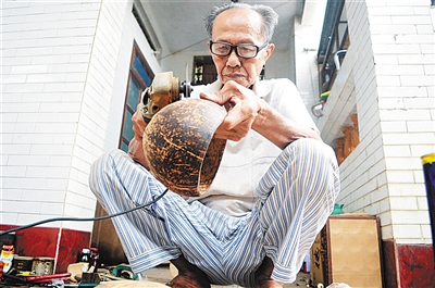 “开发音孔的原则是能小不能大。”为了让椰胡音质更好,老钟表匠出身的王仕国这时候开始发挥自己的特长了,边拉边听,一毫米一毫米地戳,直至音质完好,一把椰胡才算完工。