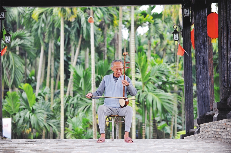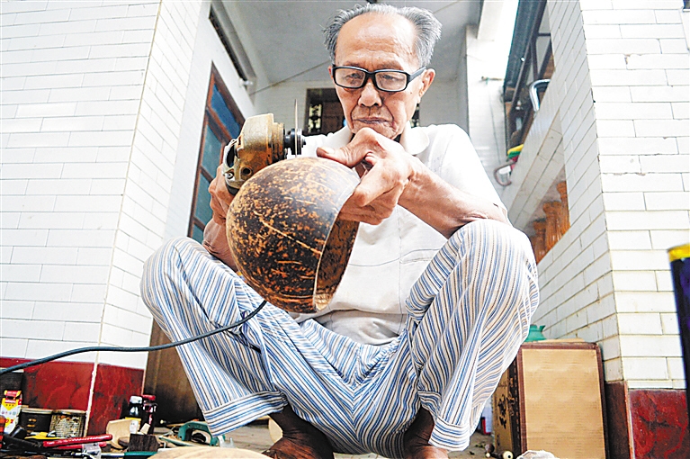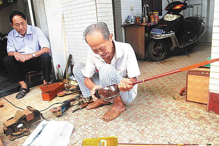 拉椰胡的老人叫王仕国,今年已是85岁高龄。凭着高超的椰胡制作技艺,2010年,他被列入海南省第二批非物质文化遗产项目传承人名录。尽管年岁已高,眼睛已经不太好使,但是耳朵听力却出奇得好。“‘听’了一辈子,锻炼出来的。”11月24日,对着来访的记者,老人将“听”字着重强调了一下,打趣地说。