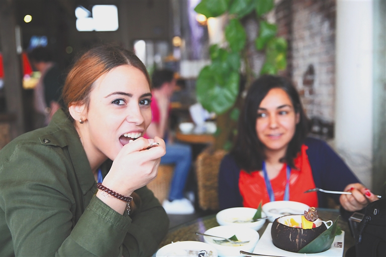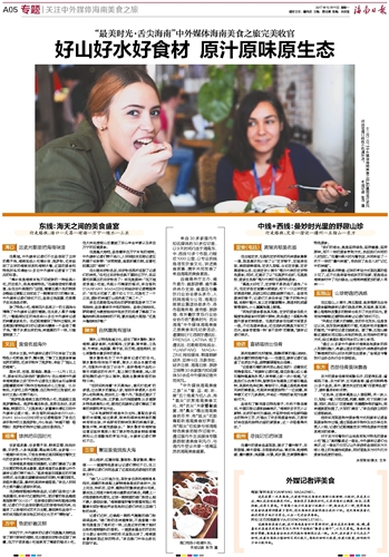 在杂粮街银海杂粮甜品店,记者们品尝过八卦鸡屎藤后,纷纷对这道既好吃,更好看的甜品翘起拇指称赞“GOOD!” 在琼海农厨好味和银海杂粮街,记者们不仅品尝到最纯正的琼海传统风味,也感受了以琼海民间艺术为主题,集观赏和品尝于一体的实用型的琼东地区民间文化艺术“博物馆”。