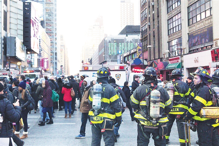 这张12月11日手机拍摄的照片显示,在美国纽约,人们聚集在爆炸地点附近。 美国纽约市曼哈顿中城11日发生爆炸,4人受伤。新华社记者 张一弛 摄