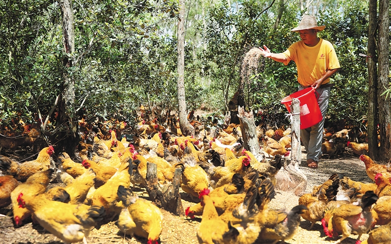 今年4月,在省地质局的牵线搭桥下,省地质物供公司、美山村委会、村里14户贫困户三方共出资68万余元,成立临高多文美山种养专业合作社,发展林下养鸡产业,累计养鸡2.6万只,收入28.9万元。