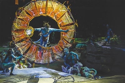 舞台剧里不仅有电影里梦幻般的潘多拉星球,巨大精美的山川,飞流直下的瀑布,还有空中飞翔的奇形异兽,夜晚中五彩斑斓的动植物,完美重现潘多拉星球的神秘与美丽。不仅视觉震撼,还布置有极具感官刺激的舞台道具。“当演员们骑着 ‘空中坐骑’从你眼前飞过时,你一定会感到震撼。”丹尼尔·拉玛尔说,整台舞台剧完美结合了声光电效果,光影配合布景变化,丛林、海洋、天空在舞台上轻松切换。