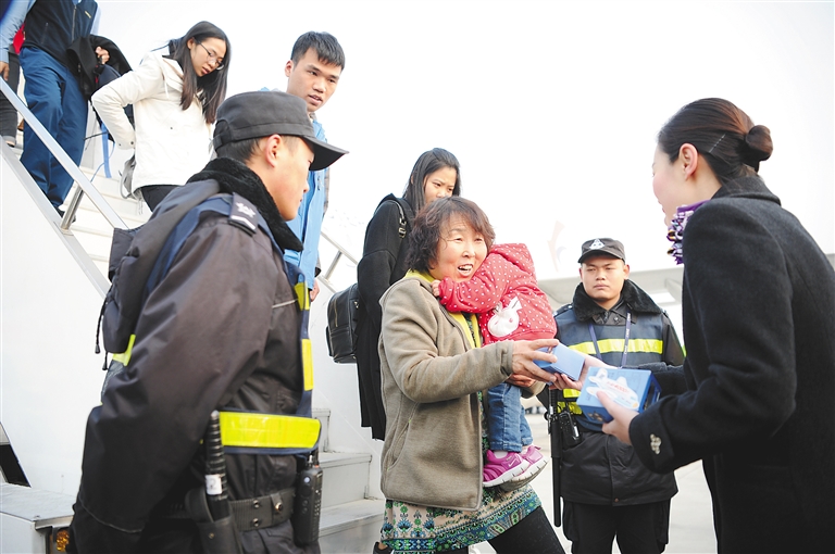 12月15日,机场工作人员为乘坐MU2324次航班的旅客赠送纪念品。 当日9时许,随着从广州飞来西安的MU2324次航班平稳降落,西安咸阳国际机场迎来了今年第4000万名旅客。至此,该机场成为国内第八家年旅客吞吐量突破4000万人次的机场。 新华社发