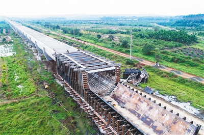 12月13日,在红岭灌区海口琼山区大坡镇田心村段渡槽施工现场,工人正在加紧施工。作为我省“水网”建设的重要组成部分,红岭灌区工程是解决我省百万人饮水、用水的重大民生工程。据了解,灌区设计线路总长约518公里,工程点多、线长、面广,涉及6个市县。目前该项目已累计完成投资超过41.48亿元,占总投资的71.9%,主体工程有望于明年底具备试通水条件。