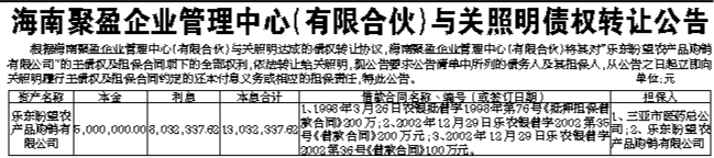 海南聚盈企业管理中心(有限合伙)与关照明债权转让公告
