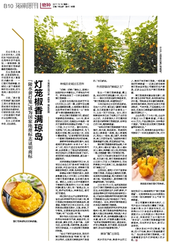 润达现代农业产业园首席专家、省农业科学院研究员肖日新介绍,黄灯笼椒这种海南独有的辣椒品种,据调查,种植历史已有五百余年,大面积栽培主要是在陵水、文昌、琼海、万宁等地,主要栽培品种是本地种和“热辣2号”“坛坛香3号”等。