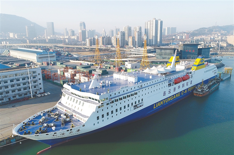 12月18日,大型豪华客滚船“和谐云港”号停靠在江苏连云港港口码头。 当日,江苏连云港港口集团的大型豪华客滚船“和谐云港”号在连云港港投入运营,开启连云港至韩国仁川的首航之旅。该船总长196米、宽28.6米、总吨位为3.4万吨,乘客定额为1080人,车道长度2480米,船上还设有超市、免税店、酒吧、棋牌室、包厢影院等娱乐休闲设施。