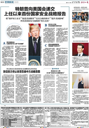 分析人士认为,新国家安全战略体现了特朗普力推的“美国优先”论,与其一贯立场相比新意不多,但与前任奥巴马政府的主张有明显差异。美国日益明显的单边主义倾向正在加剧其与传统盟友间的分歧,也无助于与其他大国的合作。